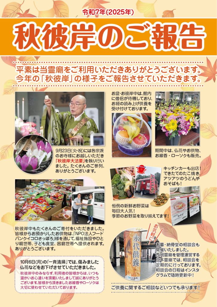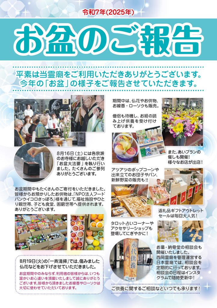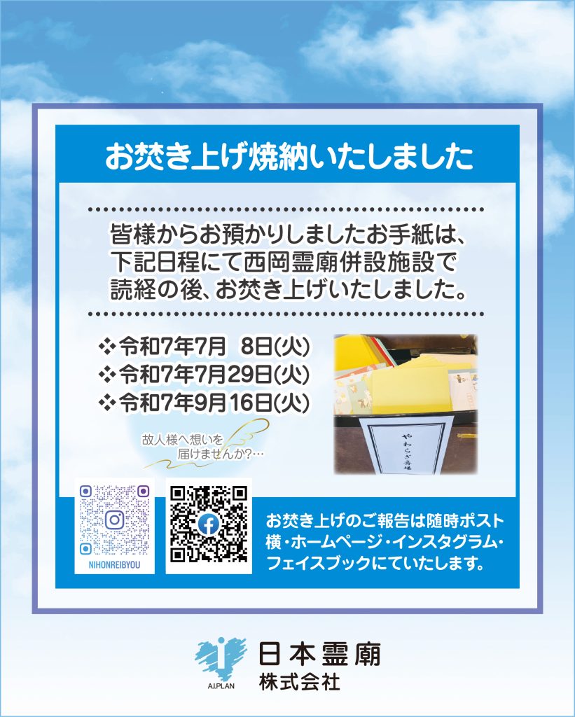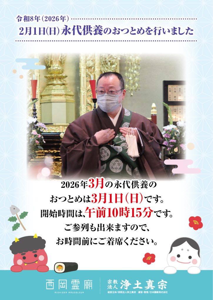 CM集のご案内 西岡霊廟のCMはこちらからご覧いただけます。 詳しくはこちら 霊廟のご案内 日本で初めて誕生した全天候型屋内霊園で冬でも納骨が可能。 使い勝手と快適性を追求した施設内の各設備は御霊をあたたかくお迎えいたします。 詳しくはこちら 管理運営会社 日本霊廟について 日本霊廟ではご供養に関する様々なお悩みにお応えいたします。 詳しくはこちら
