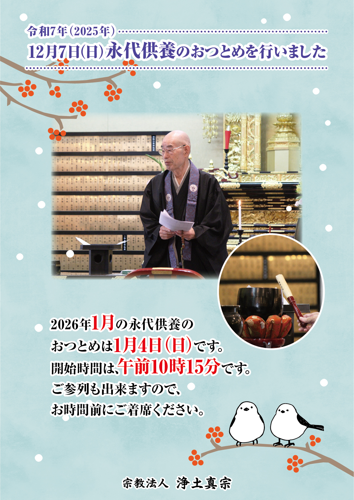 2025年12月10日 / 最終更新日 : 2026年1月5日 LifeStyle お知らせ 12月7日(日)永代供養のおつとめを行いました 令和7年(2025年) 12月7日(日)永代供養のおつとめを行いました 2026年1月の永代供養のおつとめは1月4日(日)です。 開始時間は、午前10時15分です。ご参列も出来ますので、お時間前にご着席ください。